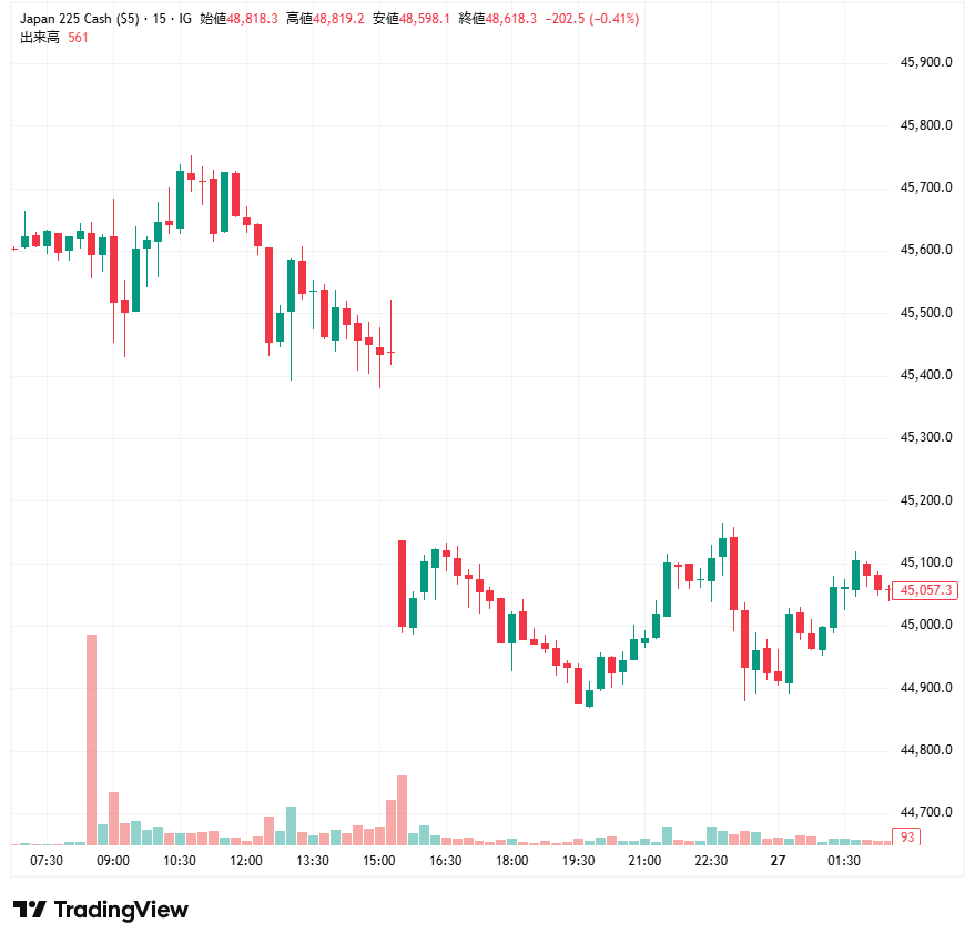 下の図は当日の日経平均株価のチャートです。15時30分を境に配当金の分だけ株価が下がっているのが分かります(約300円の配当落ち)。